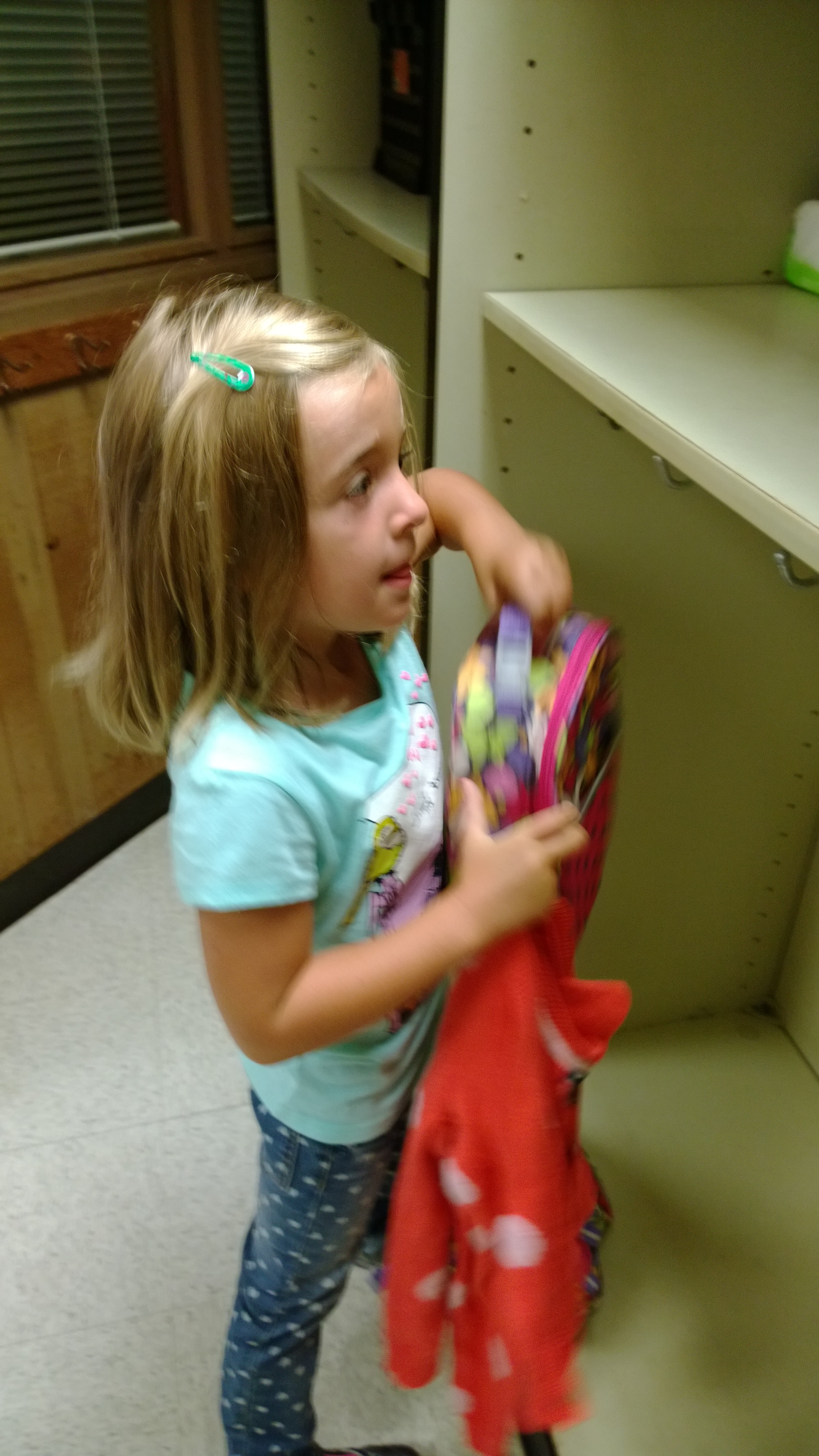 WP_20130903_08_40_44_Pro Published September 3, 2013 at 1728 × 3072 in The First Day of 1st Grade… putting away her lunch bag and backpack.
